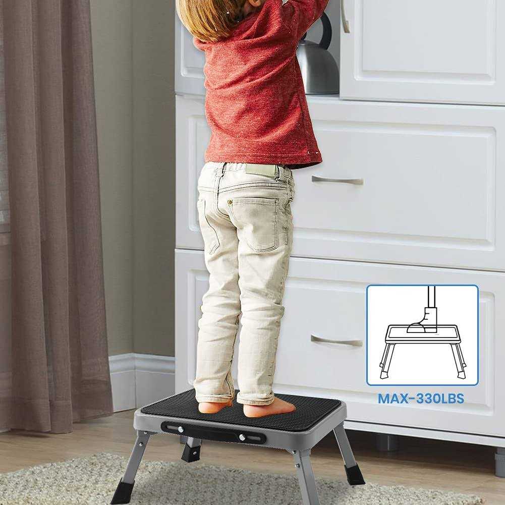 Lightweight : Less than 6 lb folding step stool easily fold and lock the legs of the step stool. Multi-Suitable : This newly designed Ladders one-step folding step stool for adults,kids toddlers, Rubber Platform anti-slip designed keep safe for everyone Multi-Purpose : Foldable step stool extra reach offered makes this stool perfect for tasks around the home or office and high beds as foot stool, office stool Durable/Safety : Sturdy kitchen step stool have 4 secure and stable legs, load capacity up to 330 lbs,foot Stool has a ribbed vinyl plastic black surface for better grip in order to prevent falls. Convenient :Easy to use folding design, Compact and easy to storage,Opens and closes in seconds.measurements folding size:15*10. *1.4 inch, Expanded:15*10*7 inch Standard :Type II Duty Rating – ANSI-ASC A14.11-2018 American National Standard 2022 newly designed TreeLen one-step folding step stool is ideal for Adults,kids and all ages. The 4 steel legs provides a large, sturdy and stable standing area and holds up to 330 lbs. Our step stool’s unique folding design allows for easy use and the thin profile when folded makes it easy to store in your kitchen, bathroom, laundry room or anywhere else in the home or office. Weighing just 5.3 lbs., this 1-step is lightweight yet extremely durable, making it perfect for all uses. br br Dimensions: /b br br Industry Standard Ladder Height (ft.):1 br Rung/Step Depth(in.):7 br Storage Depth (in.):1.4 br Width (in.):10 br Length (in.):15 br Product Weight (lb.):5.3 br br Details: /b br br Features:Foldable br Load Capacity (lb.):330 br Ladder Type:Step Stool br Number of Steps:1 br Material:Steel br Rung/Step Material:Rubber