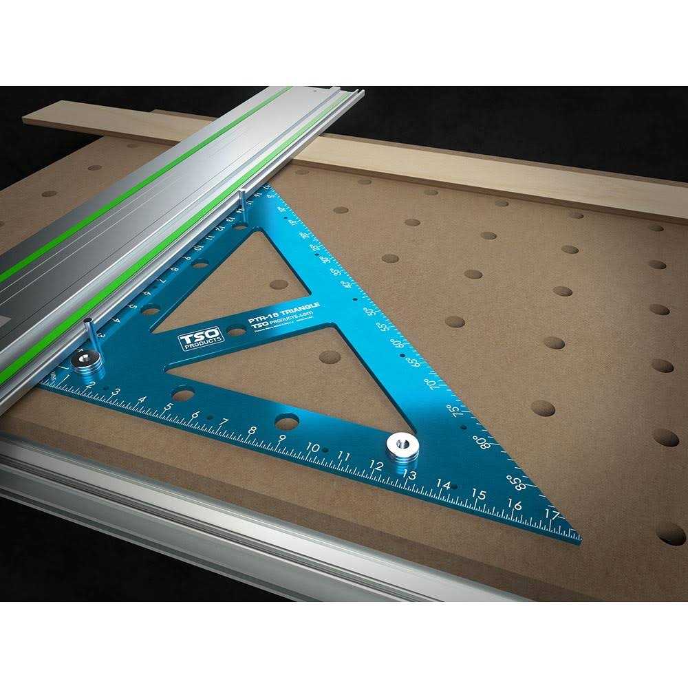 Expand your woodworking capabilities with the TSO PTR-18, part of the first precision triangle family designed to take full advantage of worktops featuring the 20mm hole pattern popularised by the FestoolR MFT/3 MultiFunction Table, or your own worktable made using the UJK Parf Guide System. Straightaway,the PTR-18 will be the most accurate triangle in your workshop, but it’s no simple triangle. Careful engineering and smart design features set the PRT-18 apart. It provides a great solution for squaring your workpiece on a 20mm hole pattern bench, verifying the accuracy of a custom-made perforated worktop, or traditional triangle duties such as angle setting on your mitre saw, marking angles, or ensuring dead-square cuts on sheet goods. With its removable foot, this triangle literally stands on its own, to verify squareness of a cabinet interior, or to register a quick 45° angle against a reference edge. The PTR-18 is made in the USA from cast aluminum tooling plate and anodised for maximum durability.