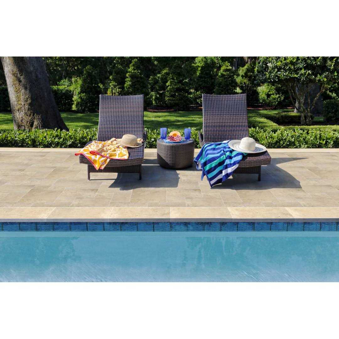 MSI The MS I’s Tuscany beige brushed travertine pool copings add a timeless Tuscan beauty for your surroundings, outdoors or indoors. Ideal for poolside’s or step treads, these are durable and have various shades of beige that create subtle visual interest. With a bullnose on one long side, the tile provides various install options that blend seamlessly to create a perfect setting. Note: Inspect all tiles before installation. Natural stone products inherently lack uniformity and are subject to variation in colour, shade, finish, etc. It is recommended to blend tiles from different boxes when installing. Natural stones may be characterized by dry seams and pits that are often filled. The filling can work its way out and it may be necessary to refill these voids as part of a normal maintenance procedure. All-natural stone products should be sealed with a penetrating sealer. After installation, the vendor disclaims any liabilities.