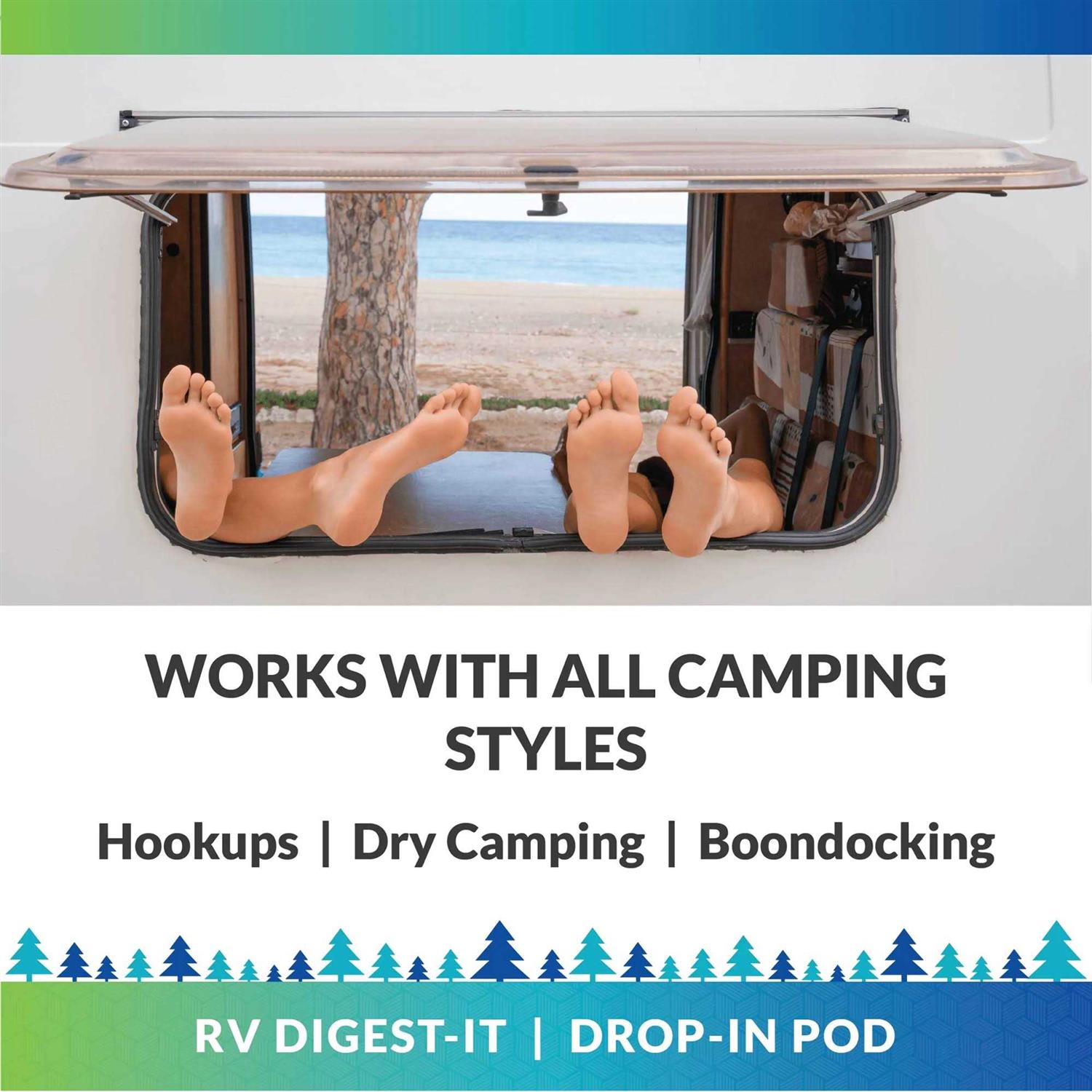 Unique RV Digest-It’s powerful bio-enzymatic blend quickly digests solid waste and residual sludge build-up inside your holding tanks, preventing backups and clogs. Its advanced blend of bio-enzymatic cleaners works quickly to remove the odor from your black and gray holding tanks, replacing it with enzymes, so your holding tanks can remain odor-free. RV Digest-It digests all brands of toilet paper and maintains properly working tank sensors and level gauges. RV Digest-It Drop-In Pods are a great option for dry campers and for those who are camping in hotter climates.