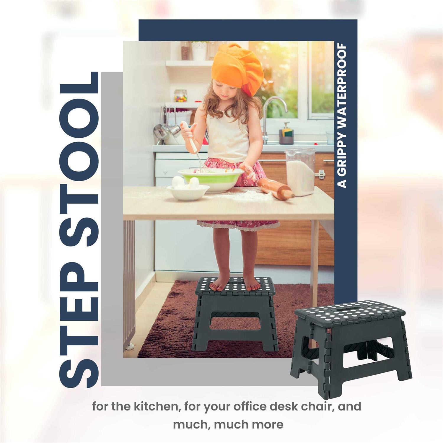 HIGHLY DURABLE – This highly durable foldable stool is made for kids and can hold up to 300 pounds. SPACE EFFICIENT – The stool is designed in a way to conserve space after it is folded up.