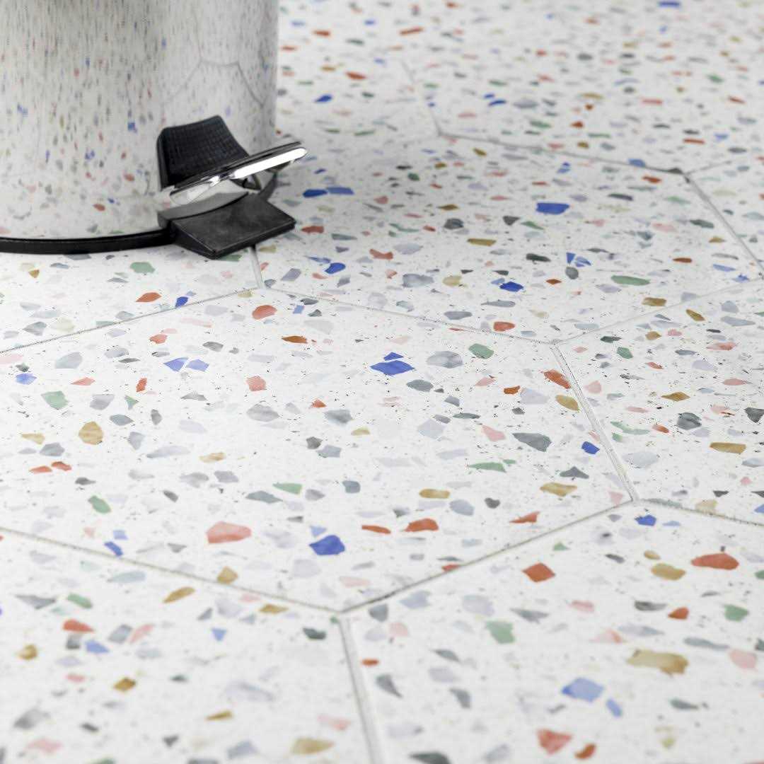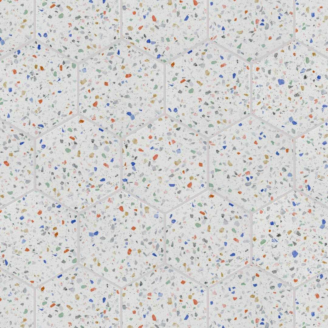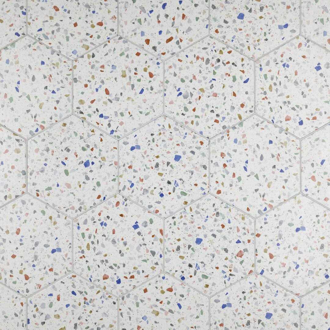 Replicating a worn concrete appearance with floating fragments of stones, our floor, and wall tile lends a burst of terrazzo-look energy to any space. This hexagon tile features speckled pattern variations, offering subtle contrast and dimension to the design. The slightly textured, matte surface features a weathered, mottled look, replicating the beauty of the aged stone. This trendsetting display of speckled monochromatic tones is visually appealing and versatile and blends beautifully with a range of design styles from vintage industrial to modern-day. Its impervious, frost-resist, and durable features make it an ideal choice for residential indoor and outdoor installations including kitchens, bathrooms, backsplashes, showers, entryways, and patios. Tile is the better choice for your space. This tile is made from natural ingredients, making it a healthy choice as it is free from allergens, VOCs, formaldehyde, and PVC.