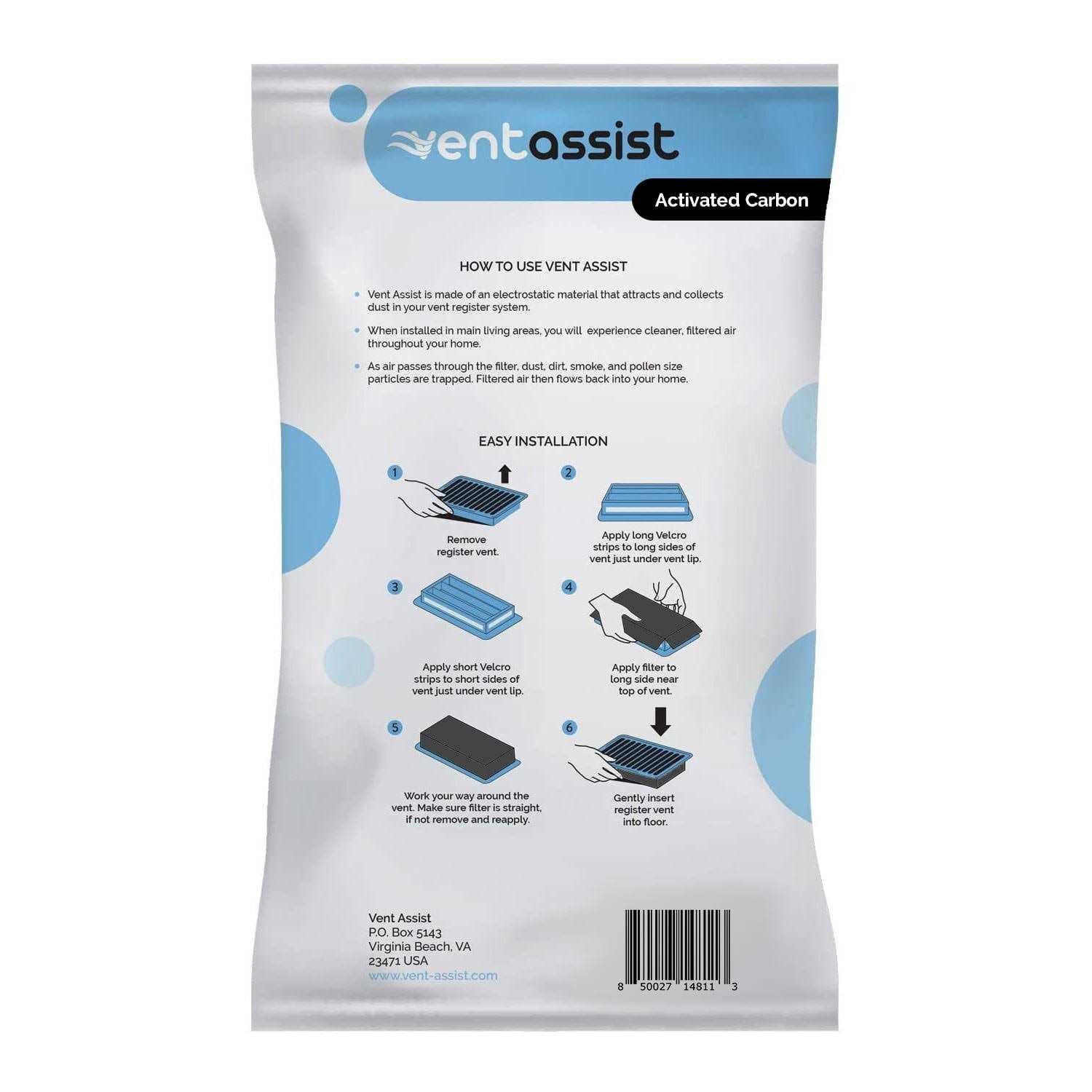 The Vent Assist Floor Register Trap and Vent Filter Combo provides 360 degrees of coverage that helps control dust, dirt, smoke, pollen and allergens in the home. Our air filters are made of a heavy density premium filtration electrostatic material that attracts and collects dust in your vent register system. When installed in main living areas, you will experience cleaner, filtered air throughout your home. As air passes through the filter, dust, dirt, smoke, allergens and pollen size particles are trapped. Filtered air then flows back into your home. Our air filters come precut. No trimming required. Enjoy fresh filtered air with Vent Assist.
