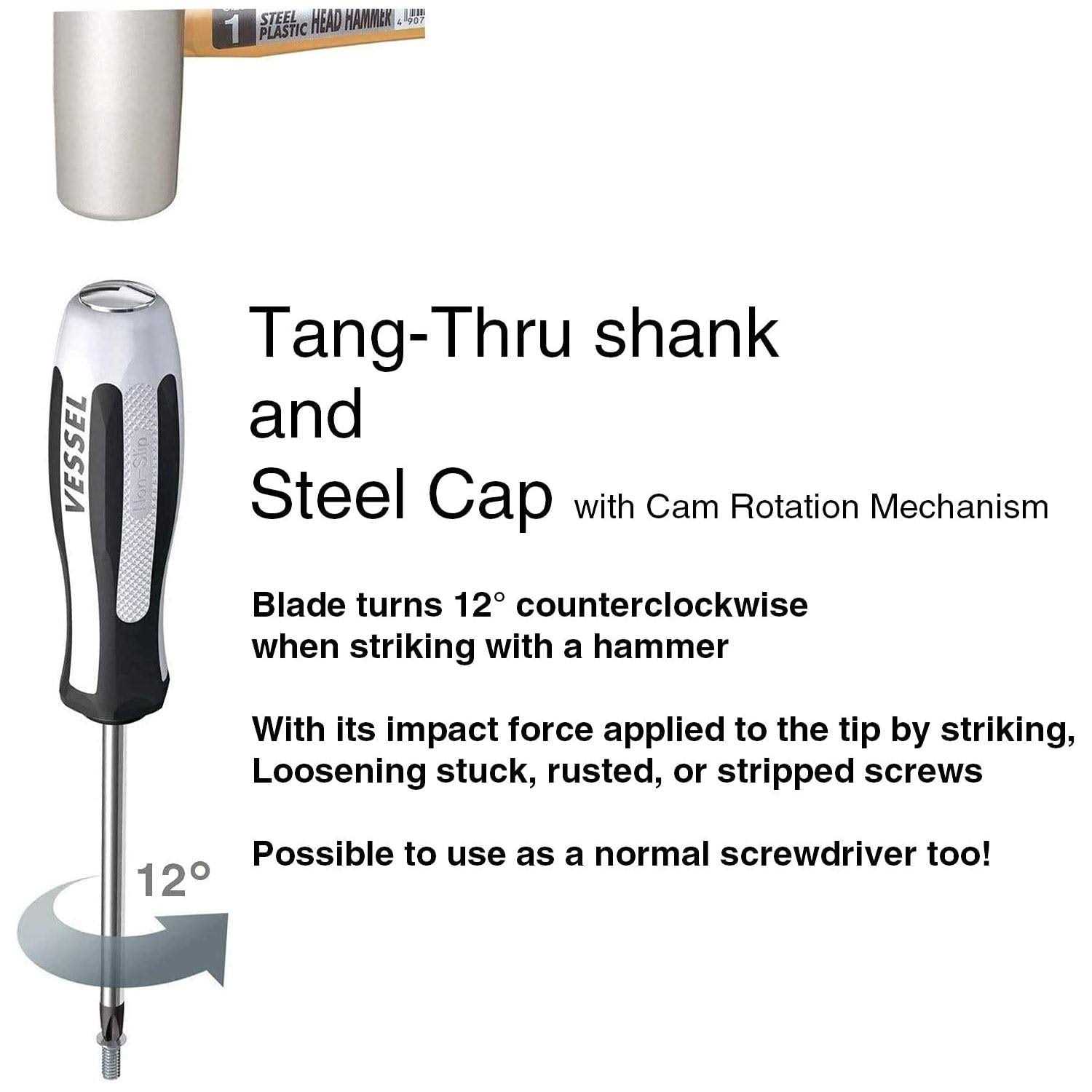 For removing stuck rusted or stripped screws. Suitable for a variety of screws from machine screws to wood screws and especially for car repairs. Megadora Impacta Screwdrivers have a Cam Rotation Mechanism to turn the stuck screw 12 when you hit the steel cap.The Impacta has a TangThru shaft so it doesnt break.