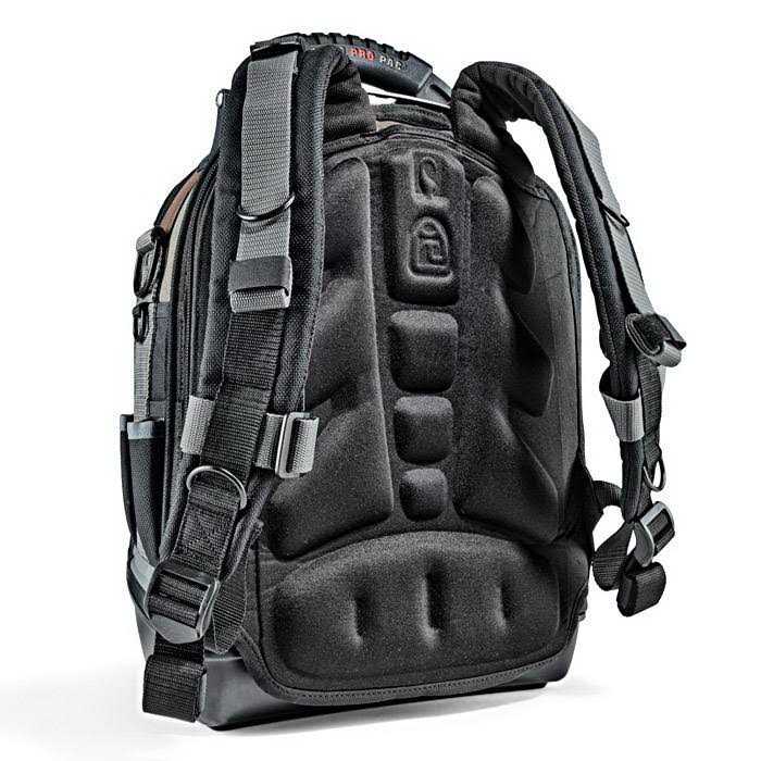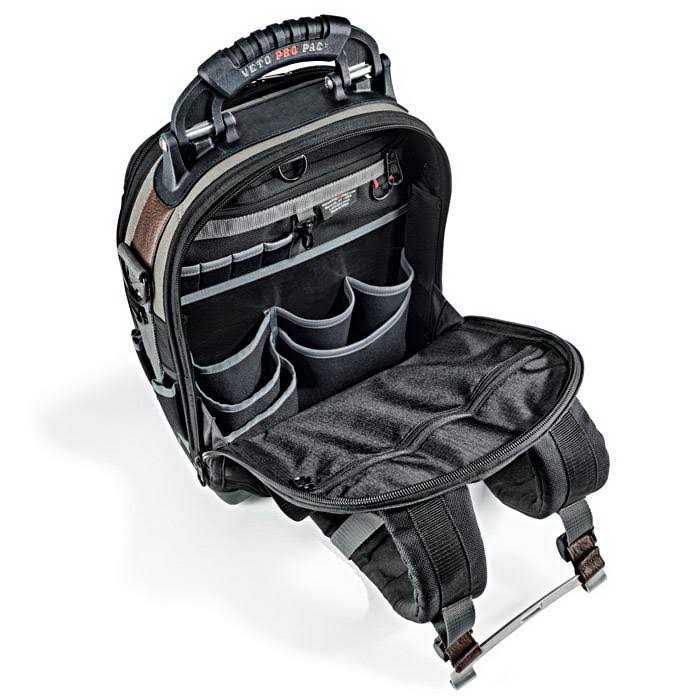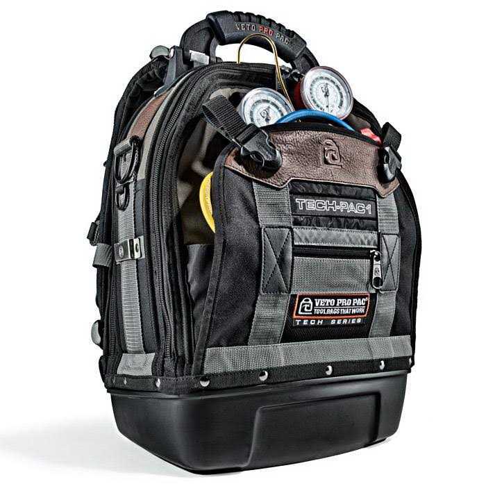 Meet the newest in a long line of workaholics. The Tech Pac was designed with Veto Pro Pac’s signature, industry leading, heavy duty construction, patented center panel design, injection molded base for weather protection and stability, it is the first fully functional, professional grade back pack tool bag designed for real world work site performance. The Tech Pac’s patented center panel design offers dual bays with two tool storage platforms in each bay. The center panel design with the main tool and meter storage options on each side centers and stabilizes the backpack. The Tech Pac, either when closed and ready for transportation or opened for quick and easy access, is designed not to tip over. The Tech Pac features 46 pockets inside and out with ample room for hand tools, meters, parts boxes, cordless drills and impact drivers and other bulkier items such as manifold gauges and hoses.Rugged Construction: Weatherproof body fabric (PVC-impregnated 1800 Denier) Stabilizing injection molded waterproof base keeps tools dry (3mm thick polypropylene) Heavy duty fastenings and zippers (marine proof rivets and industrial strength double nylon stitching oversized zipper tabs). Maximized Storage Capacity: Stores tools vertically for easy identification and access 46 exterior and interior pockets 6 zippered pockets 4 heavy duty outside steel loops Outside mounted stainless steel tape clip Patented sturdy center panel design, separates each side of the bag Ergonomic Design: Comfortable over-molded ergonomic grip Thermo-formed EVA padded back panel helps cushion the load Padded load displacing shoulder strap system with multiple adjustment strap points Quick release handle for easy access to tool bay compartment Soft sided zippered covers, secure and protect tools during transport Specifications: Dimensions: 9.85″ D x 14″ L x 21.5″ H Weight: 9.6 lbs Please Note: Pictured tools are not included