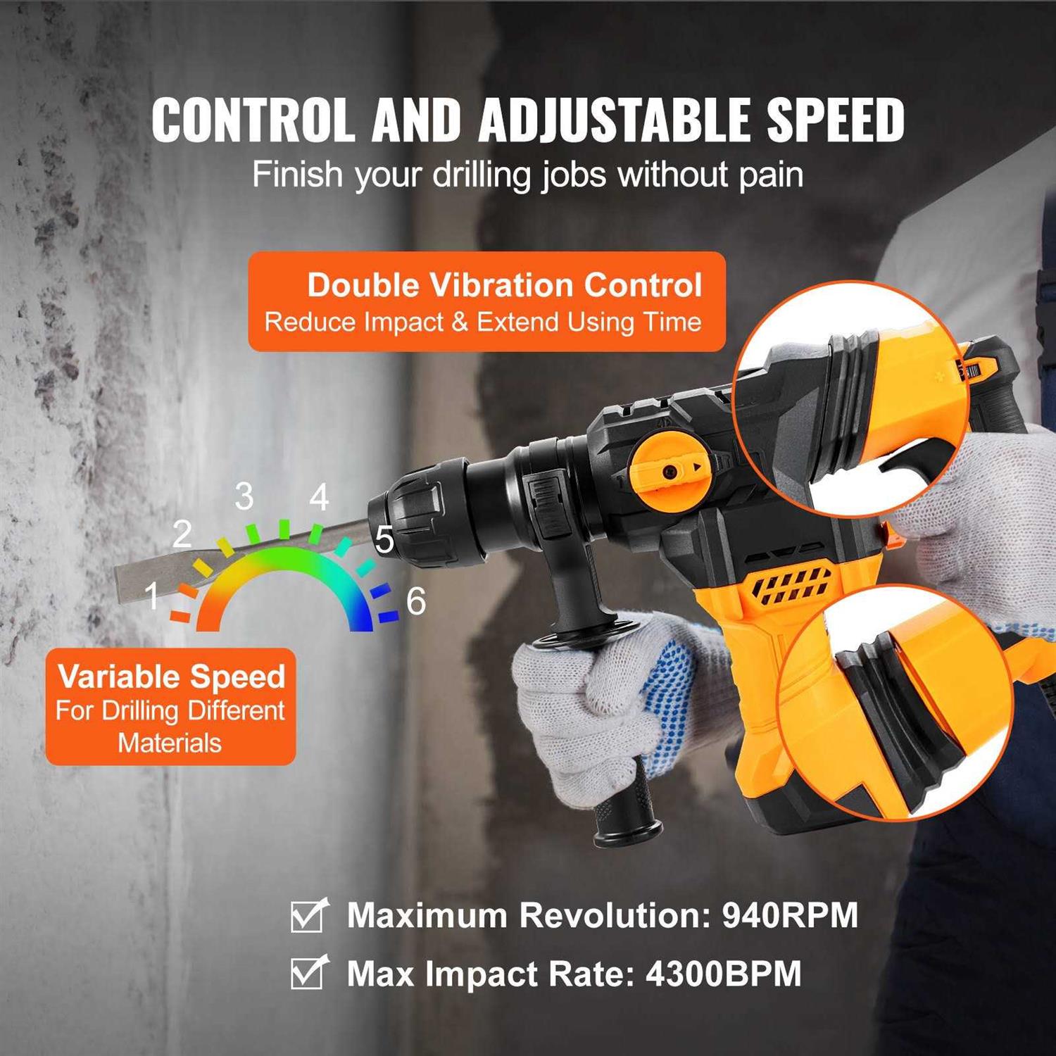 Powerful & Durable Motor: A 13Amp industrial motor with 5.5J impact energy is designed to complete heavy-duty concrete and metalworking projects quickly and precisely. Heat-resistant copper wire motor allows you to work longer without burning the machine. The max drilling diameter is 1-1/4 inch. 1500W high-performance rotary hammer drill helps increase your efficiency and improve your life. Choose Between 4 Functions: Four function modes can be easily switched: drill only(suitable for wood and steel), hammer only(ideal for concrete and brick), hammer drill function(proper for heavy-duty work), and chisel position adjustment. The corded hammer drill has double switch buttons to change the functions, allowing it to last longer than a single switch button. Adjustable Speed & Vibration Control: The hammer drill for concrete is equipped with a speed control system; You can change the speed from 1 to 6 according to your needs. It can reach 940prm no-load speed and 4300bpm max impact frequency. In addition, the double vibration control design effectively reduces injury during work. Pound away at the ground and break through any challenges with ease! Designed To Go Above And Beyond: 360° adjustable handle is designed to provide comfort, reduce fatigue, and increase control. The SDS-Plus chuck allows easy and secure bit changes to keep your project going. Well-designed heat dissipation structure can extend the hammer’s use life. So get ready to work confidently! Multifunctional: VEVOR’s heavy-duty drill set includes 3pcs drill bits, 1pcs flat chisel, 1pcs point chisel, 1pcs grease, 2pcs carbon brushes,1pcs unique dust cover, 1pcs wrench, 2pcs depth gauge, 1pcs portable carrying case. Add grease regularly for proper functioning and extended hammer drill life. The rotary hammer will make it an easy job, no matter removing tiles or demolishing brickwork. And it is suitable for wood, masonry, concrete, brick, and metal. It is also ideal for professional or daily home users.