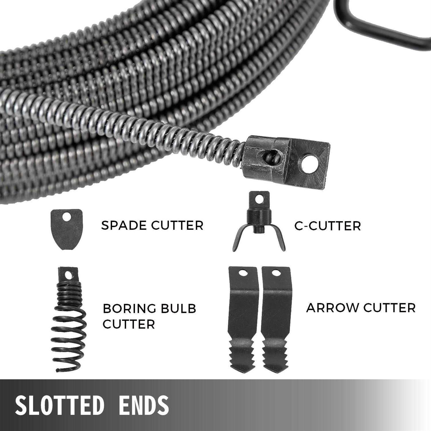 VEVOR Drain Cable Sewer Cable 100×12 Drain Cleaning Cable Auger Snake Pipe GDGJTZ100FT120001V0 609832238362 100ft x 12in Drain Cleaner Cable Solid Core Cable & 65 MN Steel & 8 Cutters A specialized solution to the harshest drain cleaning jobs is the VEVOR Drain Cleaner Cable. This drain clog remover provides a more robust choice for homeowners to clear clogged objects than traditional snakes. Including 4 shapes of cutters for different use. Suitable for main drains and sewer lines.