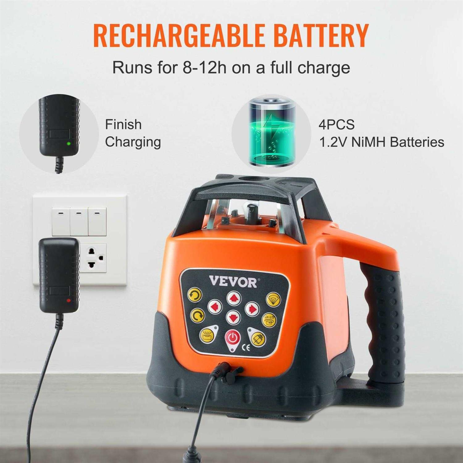 360° Rotatory Scanning: Achieve efficient and accurate leveling and alignment across the site without any hassle with our self-leveling tool. It has a tolerance of ±3° and allows for manual alignment as well. With a 360° rotating module and directional scanning mode, it provides variable rotation speed (0-60-120-300-600 rpm) and scanning angle options (5°-45°-90 -160°), allowing you to cover an entire site. 1650 ft Working Distance: Our rotating laser level has a 1650 ft working distance and clear laser output for industrial and commercial applications. It comes with a laser detector and a pair of eyeglasses to help you accurately capture and interpret laser signals and protect your eyes when working at longer distances or in bright lighting conditions. Rechargeable Battery: Are you ready to dive into power? Our level laser tool is powered by 4PCS 1.2V NiMH batteries that run for 8–12 hours on a full charge (including charger), ensuring that you’ll be able to complete your tasks efficiently without the need to frequently recharge or replace batteries when things matter most. Premium Material: Our user-friendly rotary laser level gives you peace of mind with its IP66 rating. It features a rugged, high-impact composite housing that protects the internal mechanism from water and dust, ensuring long-lasting reliability even in tough conditions. Effortless Use: Designed with intuitive interfaces, you’ll have no trouble getting started. Plus, enjoy the convenience of our included remote control, which allows you to operate the level from up to 65 ft away. It also features a 5/8″ thread for easy tripod mounting and is compatible with your existing equipment, making it even more convenient.