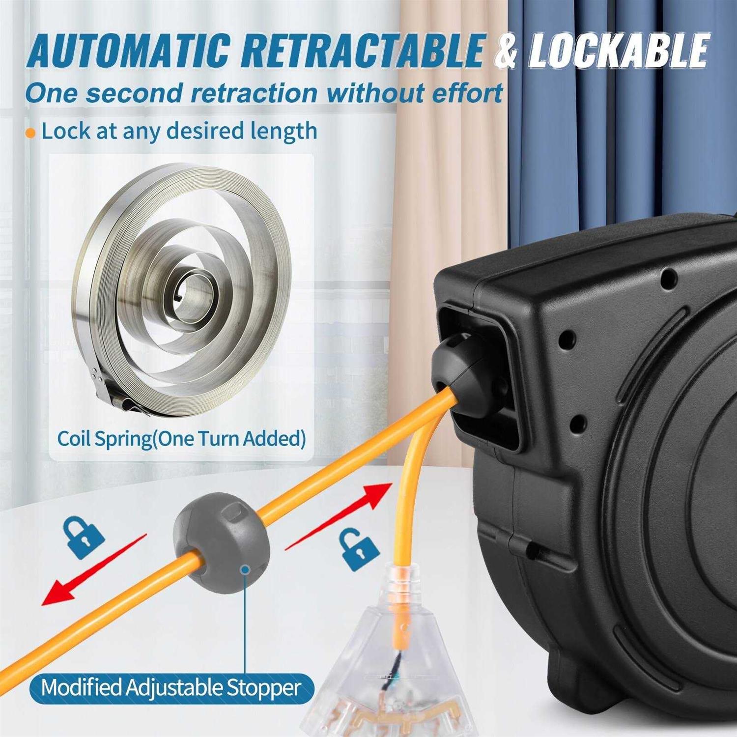 VEVOR heavy-duty retractable extension cord reel comes with a 65 ft. extension cord, a 4.5 ft. lead-in cord, an automatic retractable system, and a 15 Amp circuit breaker with a reset button. The retractable electric cord reel is the perfect way to power up your devices anywhere and organize cables without tangling or kinking. Suitable for garages, homes, gardens, workshops, repair shops, auto shops, construction sites, etc. Get ready to power up and take control of your space with VEVOR!.