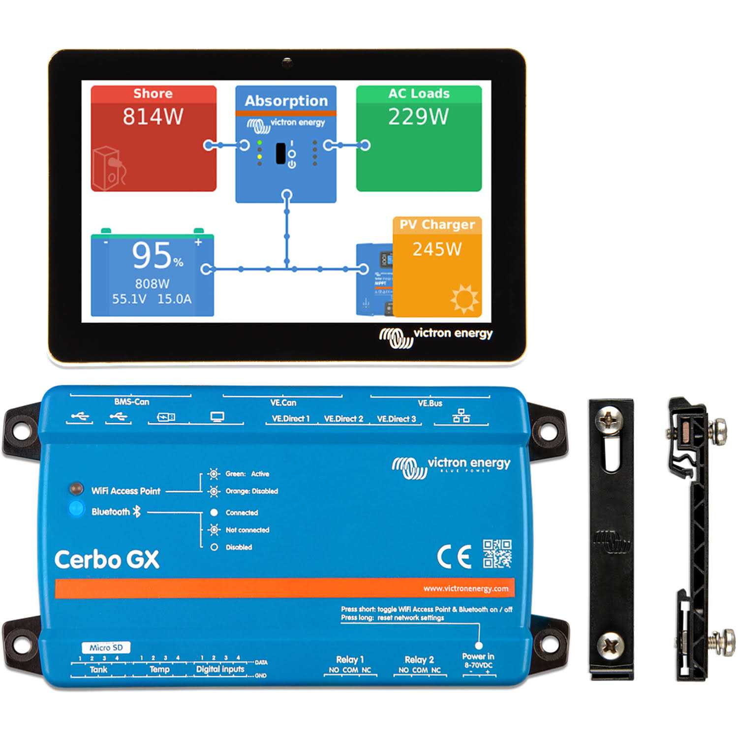 Victron Cerbo GXThe Cerbo GX maximises the performance of your systems components in real-time and keeps them in perfect tune. With its Dual Core Processor and the addition of an extra CAN-bus port you can now support even bigger systems; closely follow managed (lithium) batteries while the second port can support up to 25 simultaneously connected VE.Can solar chargers. The new NMEA 2000-out support has the GX easily integrated into any boats network. Four tank- and four temperature ports as well as 3 VE.Direct ports, 3 USB ports, 4 digital inputs and 2 relays allow you to expand control to a new level. Maximising systems performance was never this easy.This all-new communication-centre allows you to always have perfect control over your system from wherever you are and maximises its performance. Simply connect through our Victron Remote Management portal, or access directly, using the separate GX Touch 50, a MFD or our VictronConnect app thanks to its added Bluetooth capability.