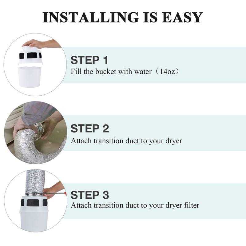 Safety for indoor dryer venting, ideal for apartments, condominiums and RVs 3 Layer Filtration – 1water filter; 2iron mesh filter; 3high temperature resistant lint filter Multiple Package for you to choose from: 1dryer vent kit without duct; 2dryer vent kit with 5-feet DOUBLE LAYER WHITE duct; 3dryer vent kit with 5-feet SLIVER duct Quick and easy to install, please note that when you snap the hose to the filter bucket and the dryer it may be a little laborious, this design makes the connection more stronger This dryer vent filter is detachable and can be reused after cleaning