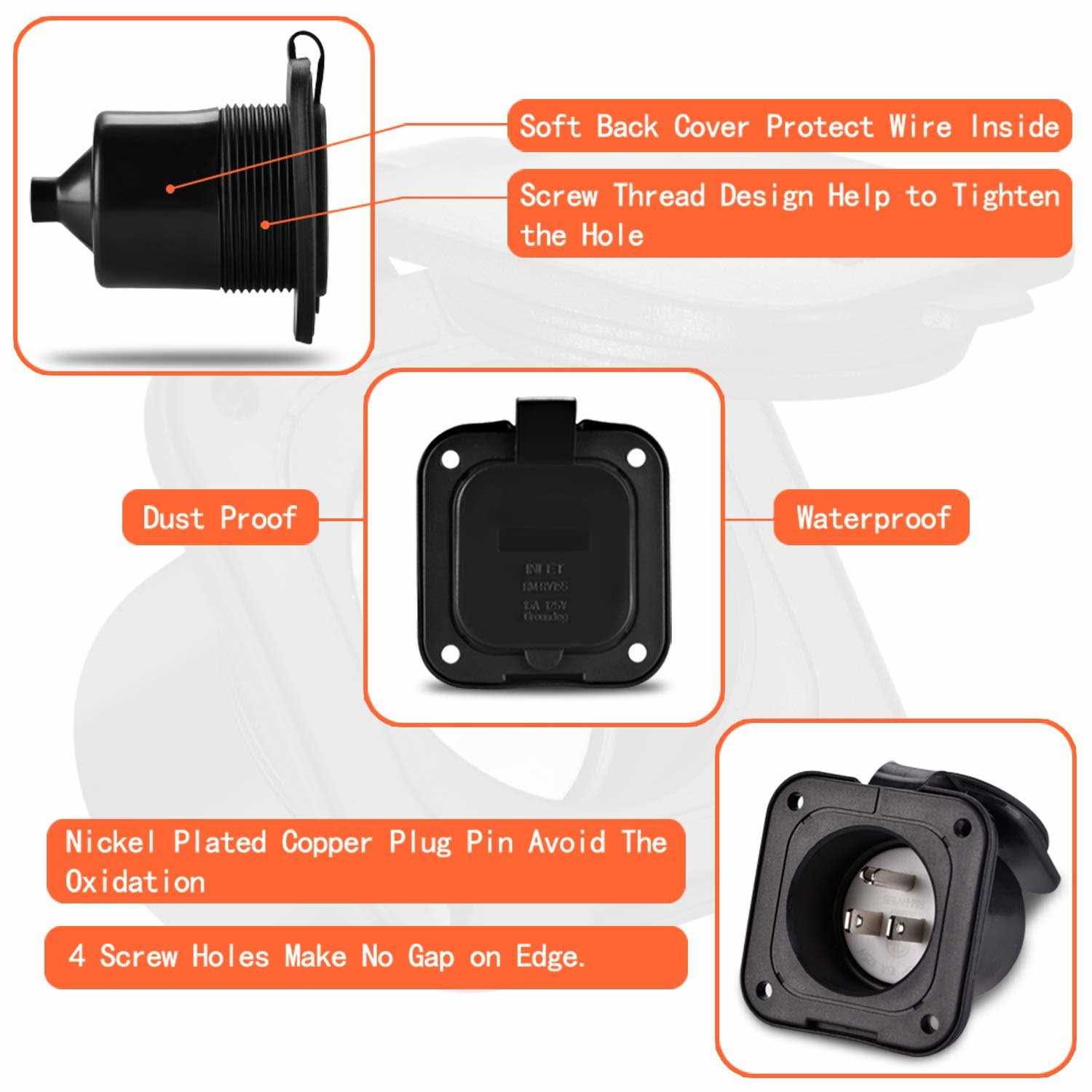 【15 Amp Flanged Inlet】: No oxidation for the Nickel coated copper pole on the plug, made of premium copper and Nylon plastic to avoid the damage of UV degradation and chemicals, rugged and durable for indoor and outdoor. 【Easy Reliable Installation】: 2″ Hole size required, clear see-thru wiring block (Black-Hot, Green-Ground, Silver-Neutral), and 4 long Stainless Steel screws will fix straight blade flanged inlet on the hole or wall more tightly. No gap on the edge! 【 Weatherproof Cover】: ETL approved, and the flanged power inlet cap and back cover will protect it from the rain storm, snows, dust and even works well in Western Colorado winters, without crack and leak. 【Wire Up As You Wish】 : Define the Length and Diameter of the cord based on actual need. Flanged electrical inlet receptacle accommodates 12-18 AWG gauge wires, suitable for No. 12-3 through No. 18-3 cords grip. 【Widely Compatible】: As a generator or battery charger plug to energize your electrical devices. Widely used in trailer, camper, RV, car, boat, marine, block heater,home, bumper, recessed outlet box, etc