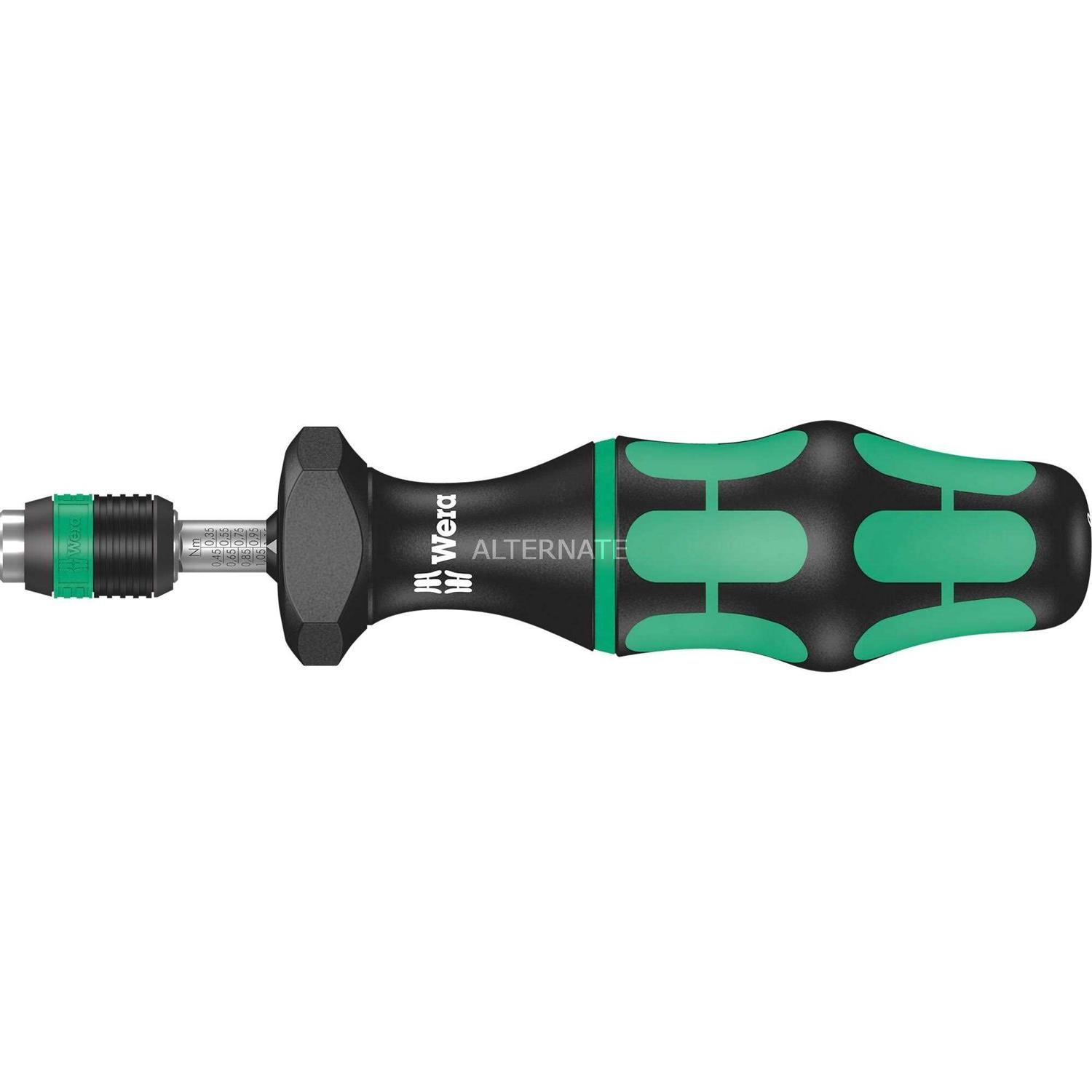 The Wera Adjustable Torque Screwdriver allows for torque-controlled tightening of fasteners to prevent damage to screws or workpieces, while ensuring the dependability of the screw connection. This makes it particularly useful in assembly and maintenance applications as well as anywhere that repeat accuracy is required. The required torque can be quickly set by hand, with an easy to read scale showing the current level of torque. Once the pre-set torque is reached, there is a distinctly audible and noticeable excess load signal. Rather than special blades, the screwdriver has a built in Rapidaptor that is suitable for use with normal 1/4′′ hexagon insert bits or even 1/4′′ sockets. Wera’s multi-component Kraftform handle, with special hard and soft zones, allows for fast working while protecting the palm of the hand. It also incorporates a non-roll feature to prevent the screwdriver from rolling away when it is put down. This torque level can be pre-set to a value between 0.3-1.2 Nm, or unlimited torque can be used for loosening seized screws. Measurement accuracy is +/- 6% in accordance with the European standard EN ISO 6789 and the torque screwdriver is supplied with a calibration certificate.