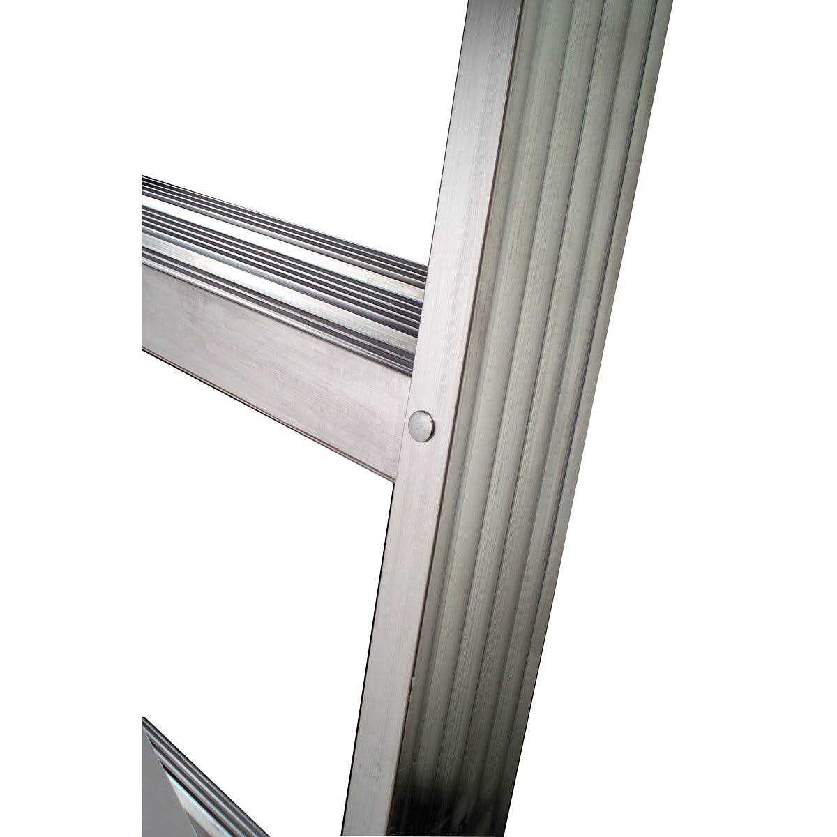 The 364 aluminum 4 ft step ladder has a duty rating of 250 lb and TOOL-TRA-TOP that feature a convenient tray for holding tools or a paint can and slots for a paint roller tray. There is also a sturdy molded paint can hanger on the back of the top. The automatic Spill-Proof pail shelf opens and closes with the ladder. The Traction-Tred steps are slip-resistant.