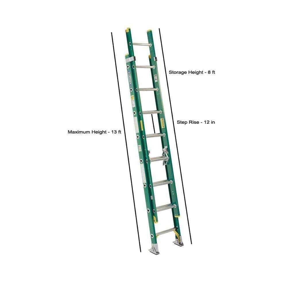 The Werner D5916-2 16′ Fiberglass Extension Ladder is outstanding for contractors and DIYers alike. It is duty rated for 225 pounds and features large extruded spring locks and a rail shield bracket for durability and strength. This Werner Extension Ladder also comes with a slip-resistant shoe pad and spur plate made of rubber. Its D-rings are flat and deeply serrated for safe and easy climbing. The Werner D5916-2 16′ Fiberglass Extension Ladder has rung wear sleeves made of polyethylene for additional safety.