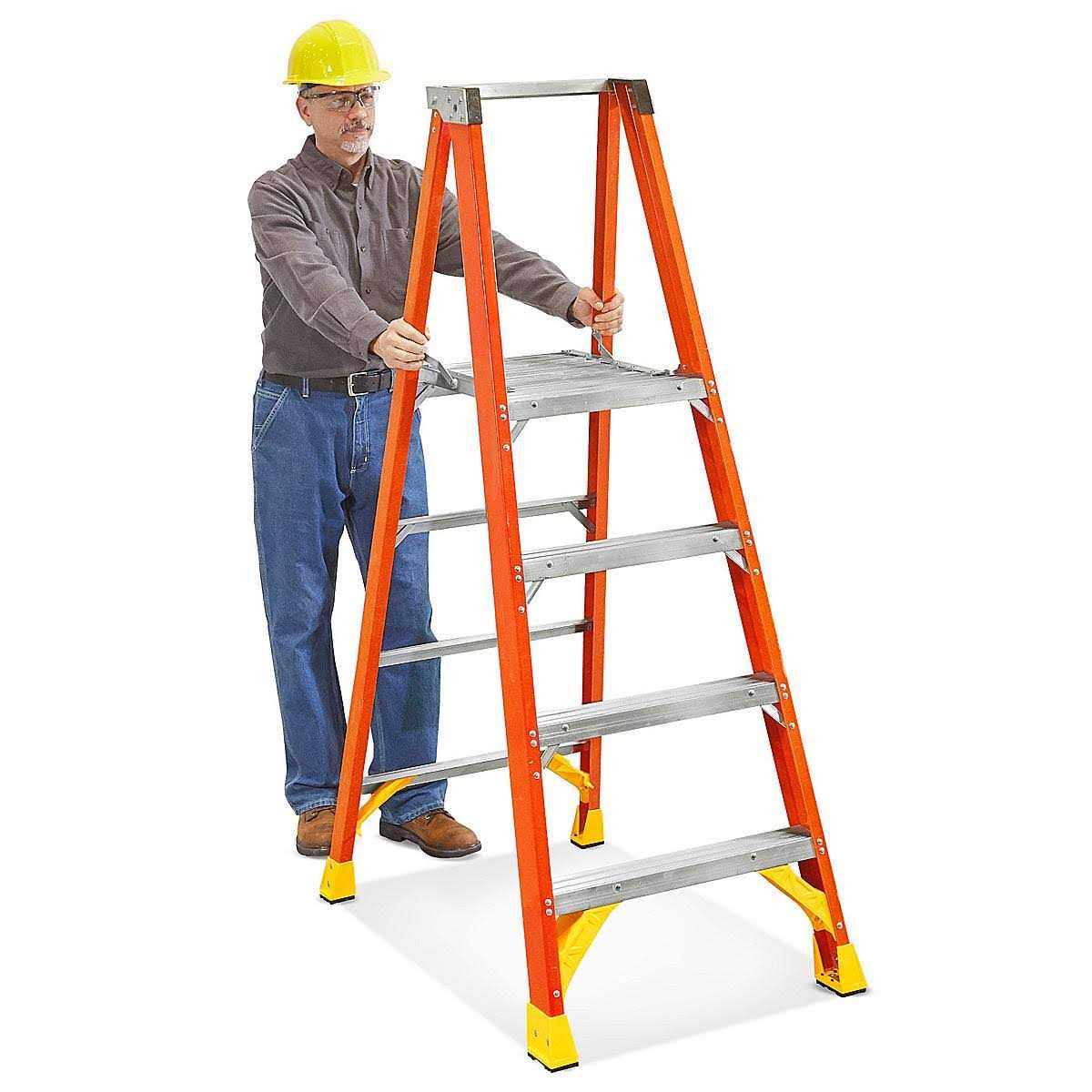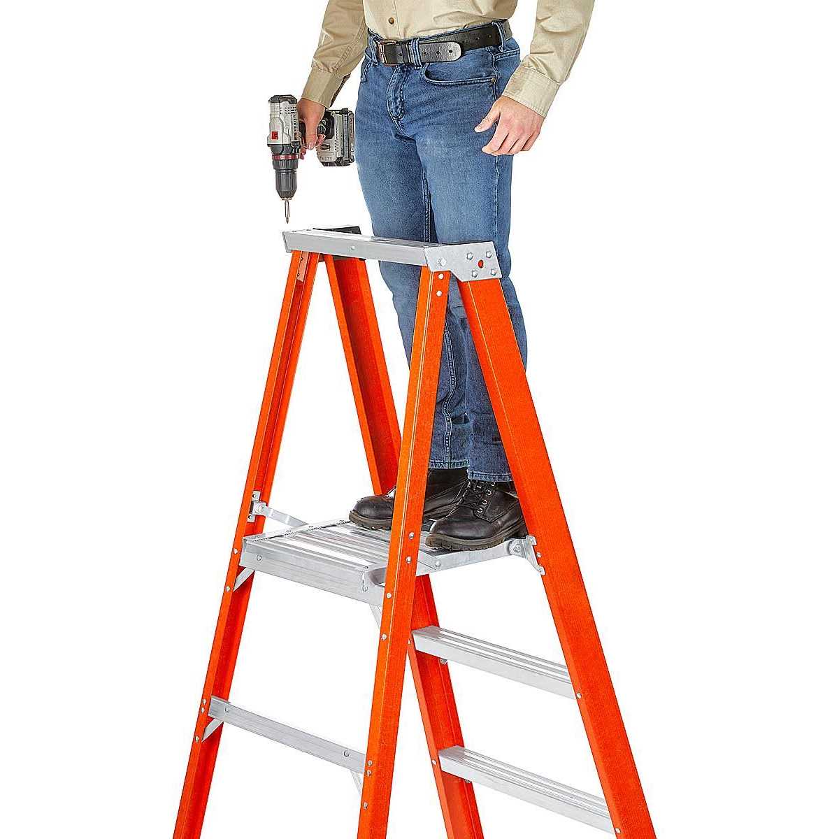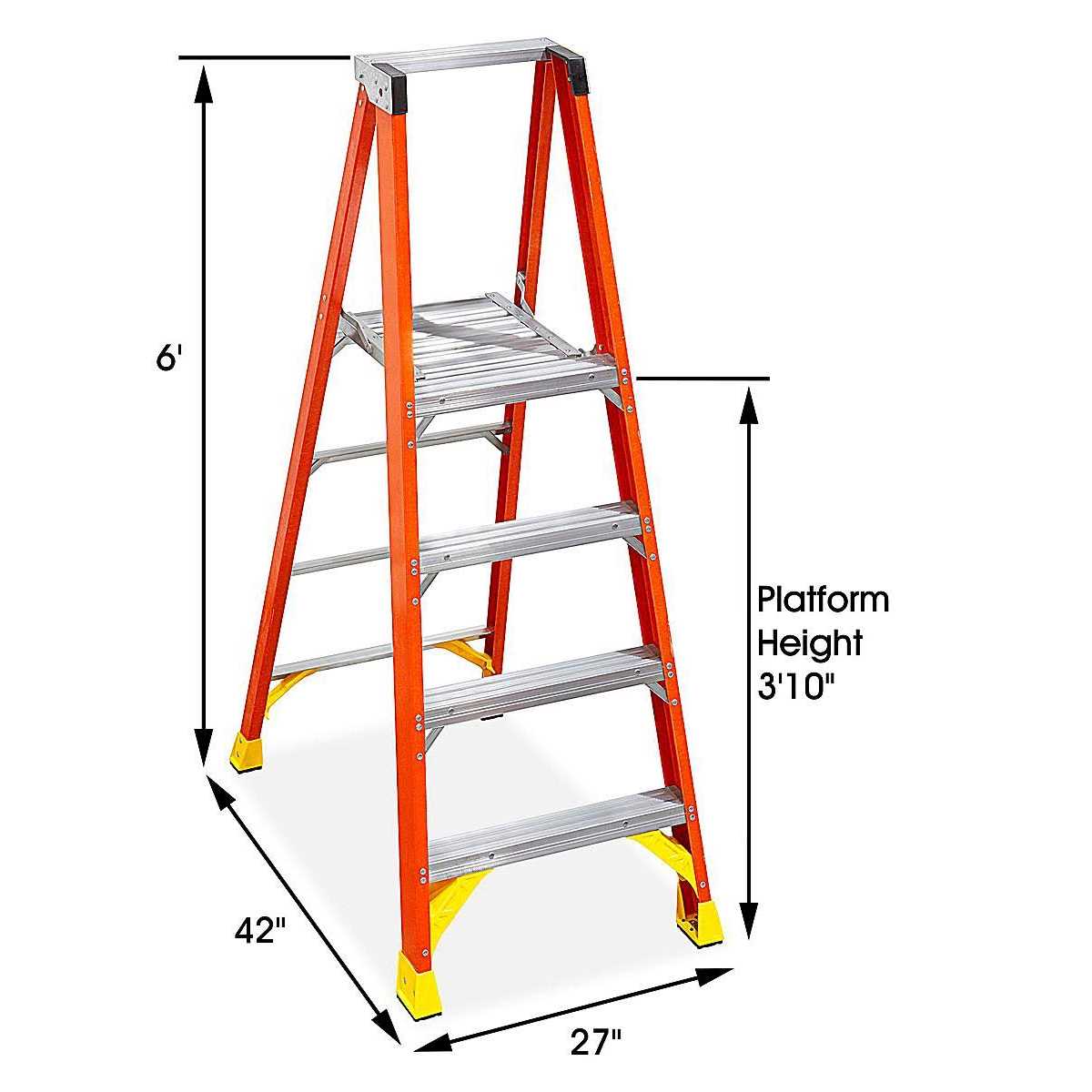 Fiberglass Platform Ladders – Working off the ground requires high–quality industrial ladders. Electricity safe. Fiberglass rails are non–conductive. Nonslip rubber feet. Slip–resistant 3″ steps. Reinforced edge bracing. Comfortable 14 x 15″ work platform with 24″ high safety rail. 300 Lb. load capacity.