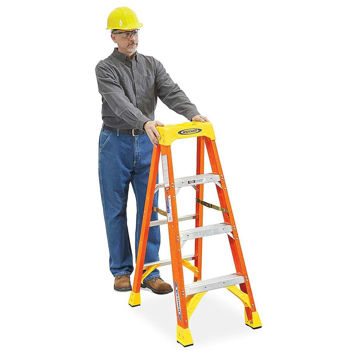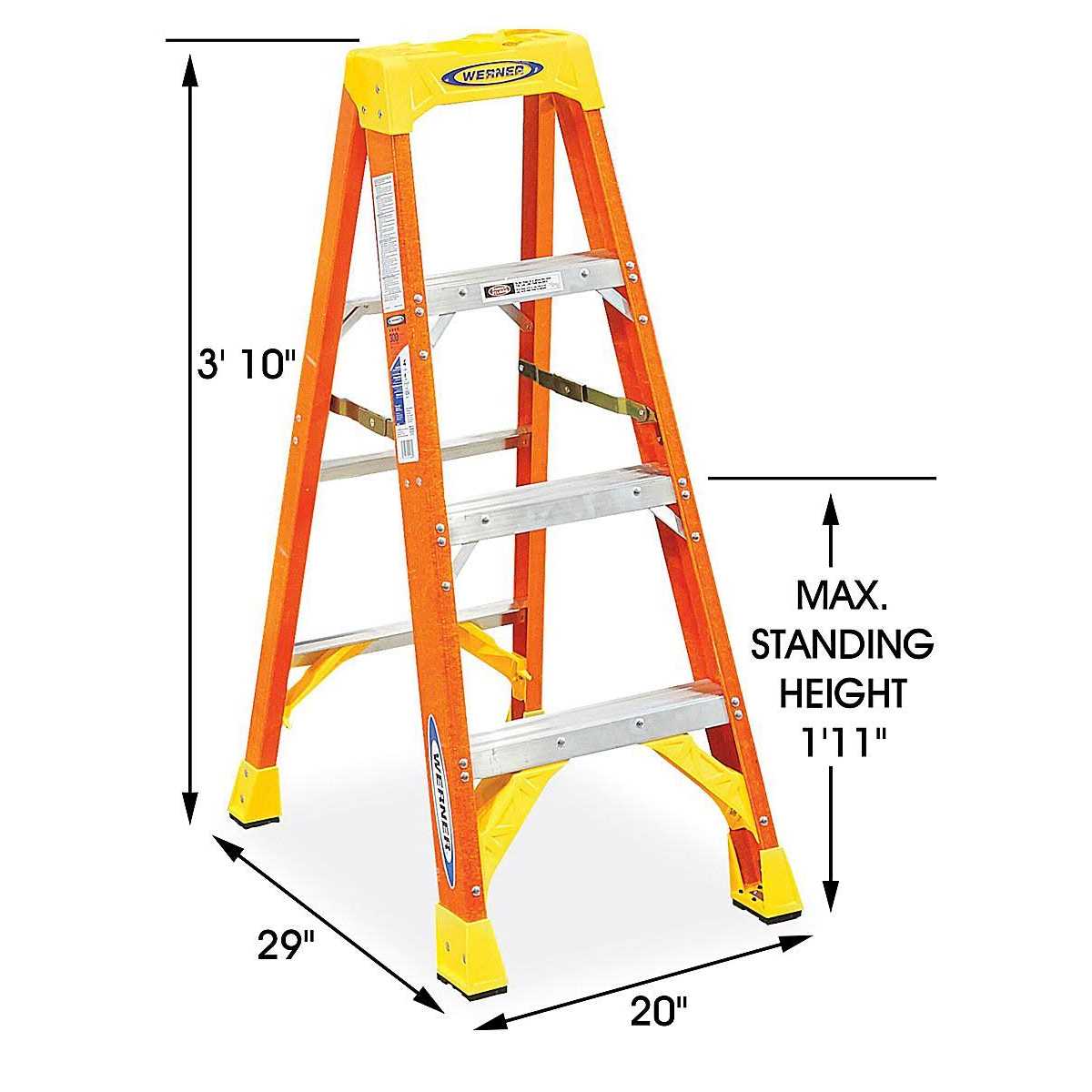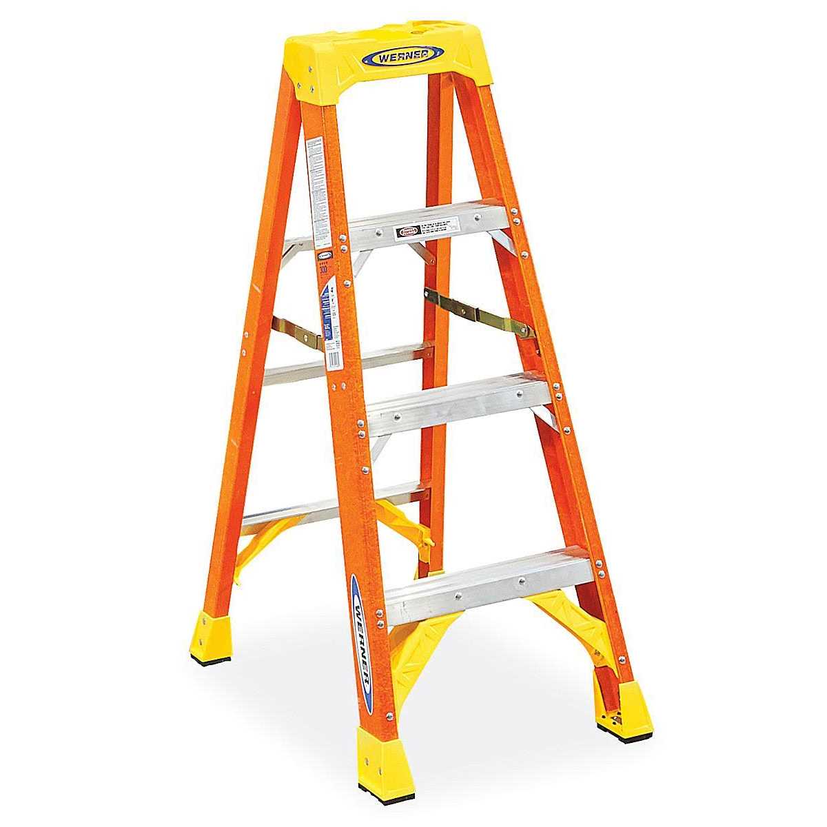 Fiberglass Step Ladders – Werner Working off the ground requires high–quality industrial ladders. Electricity safe. Fiberglass rails are non–conductive. Nonslip rubber feet. Slip–resistant 3″ steps. Reinforced edge bracing. Holster–Top platform holds tools and paint cans. 300 lb. capacity.