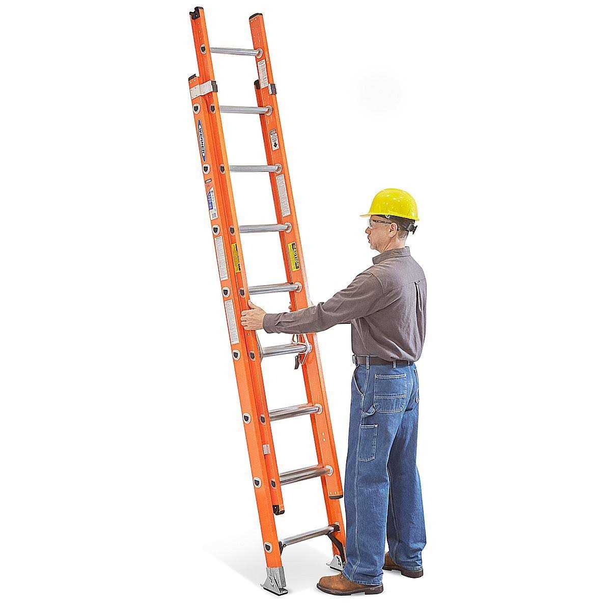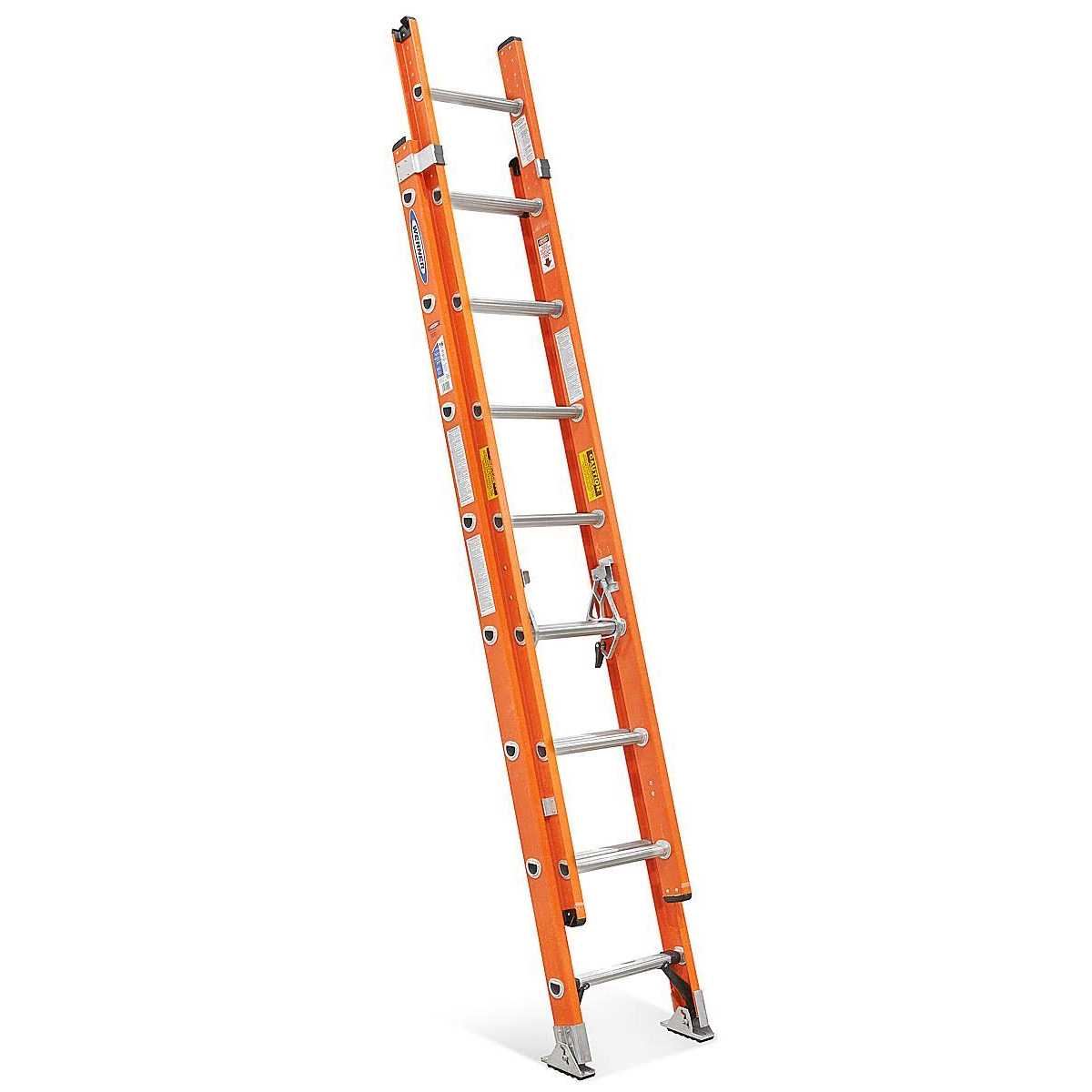 Fiberglass Extension Ladders – Werner Working off the ground requires high–quality industrial ladders. Electricity safe. Fiberglass rails are non–conductive. Reinforced edge bracing. Gravity spring locks secure ladder at heights up to 13′. Slip–resistant D–shaped rungs, rubber shoe pads. Spur plates for safety on soft ground. 300 Lb. load capacity.