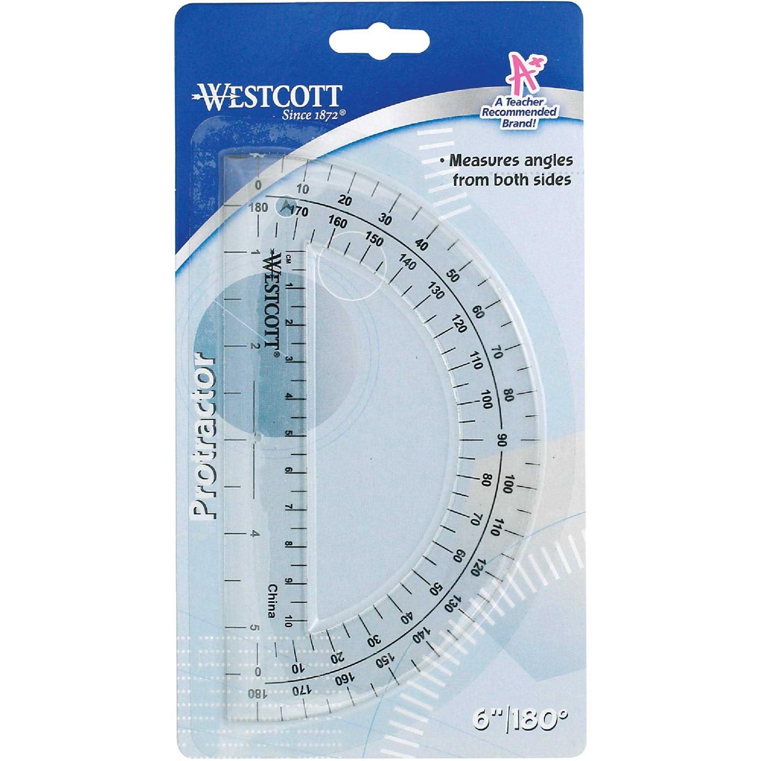 This Westcott Plastic Protractor is ideal for home, classroom or studio use. It measures angles from both sides, which makes it a handy teaching tool. Durable, transparent plastic construction makes it easy to use. It has an accurate 4 inch ruler at the base with highly visible English and metric system markings. This 180-degree Westcott protractor also has sharply defined graduations, and it comes in a plastic sleeve for storage.