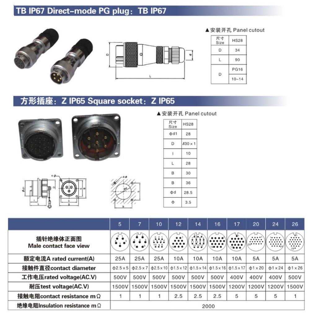 WF28 10pin 500V AC high voltage heavy industrial power solder connector, φ28mm panel cut Contact: φ2.5mm*10(Gold plated copper), 25A / 500V, Contact resistance: 1 mohm Wire: <2.5mm= AWG12-16, Cable: 10-14mm, Connected size: 4.1*1.3inch / 104*33.8mm Pin number available: 5/7/10/12/16/17/20/24/26pin, Plug: IP20, socket: IP67 Professional and trusted power connector wholesale and retail supplier. Waterproof level: Socket- IP67 WITH CAP ON SOCKET, PLUG-IP44 WITHOUT CAP Product name: WF28 10pin heavy industrial metal power connector Contact: φ2.5mm*10(Gold plated copper) Rated current: 25A Working voltage: 500V Test voltage: 1500V Contact resistance: 1mΩ Insulation resistance: 2000mΩ Wire: <2.5mm = AWG12-16 Cable: 10-14mm IP rating: Plug: IP20, socket: IP67 Mating cycle: 500times Temperature range: -25~+65°C Shell material: zinc alloy Pin number availalble:5/7/10/12/16/17/20/24/26 pin Connector whole size: 4.1*1.3inch / 104*33.8mm