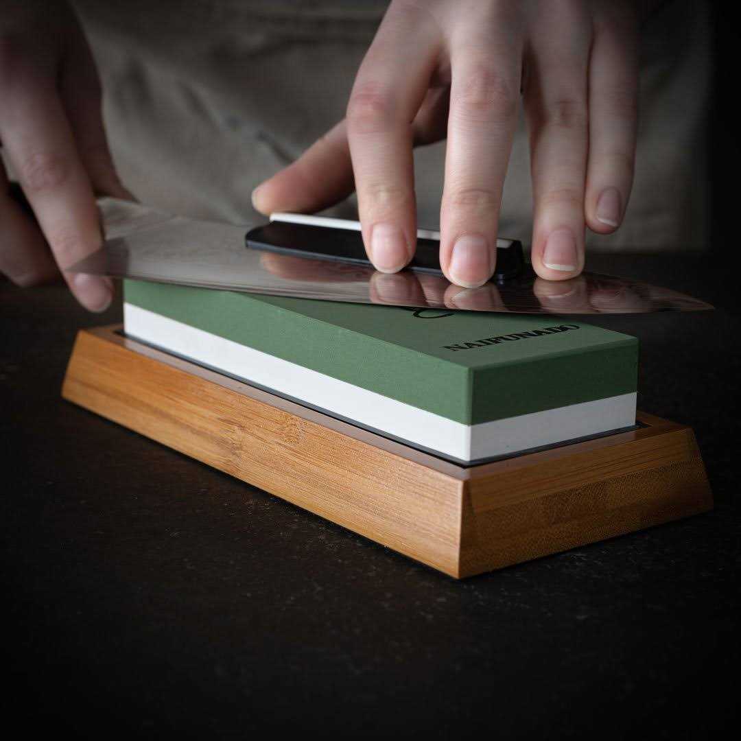 The stone comes with two grit variations: The coarser 1000-grit side gets your dull blade sharp as original quickly; while the 6000-grit polishes and smooths the sharpened knife, finishing the sharpening process. The base is made from bamboo and padded with rubber, keeping it in place. An additional silicone base sits between the stone and the base, keeping the whole unit stable while sharpening. The angled guider holds the knife at the correct angle allowing, even beginners, to safely apply consistent pressure to sharpen knives.