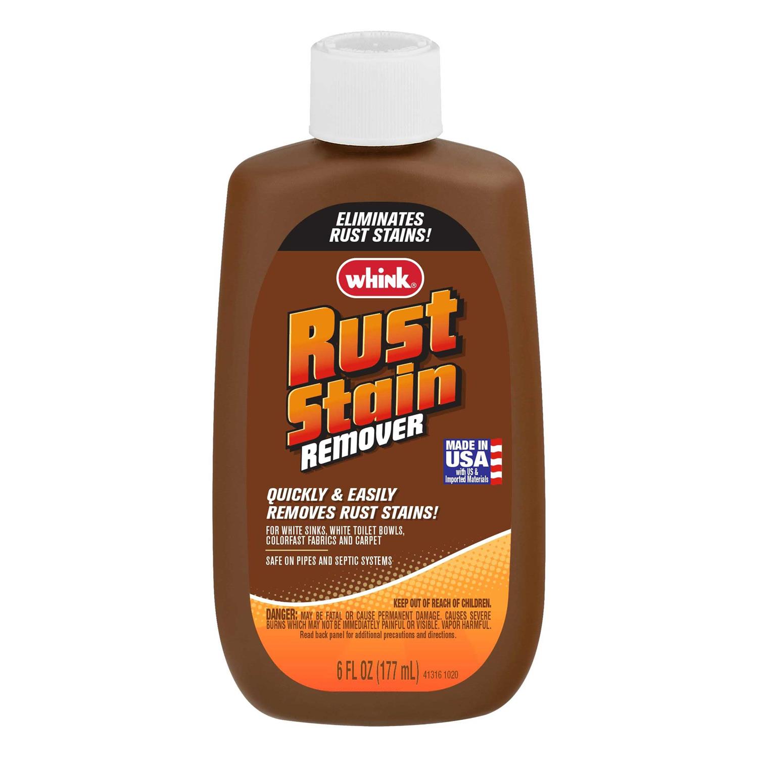 Whink Rust Stain Remover-1261, 6 Ounces: Can use it in white sinks and toilets, and it is safe for all pipes and septic systems. With the powerful and convenient liquid formula, no scrubbing is required. It has been the number one brand for removing stains since 1947. This Whink stain remover is carpet and colorfast fabrics safe and comes in a 6 oz easy-to-store, shelf-stable bottle.