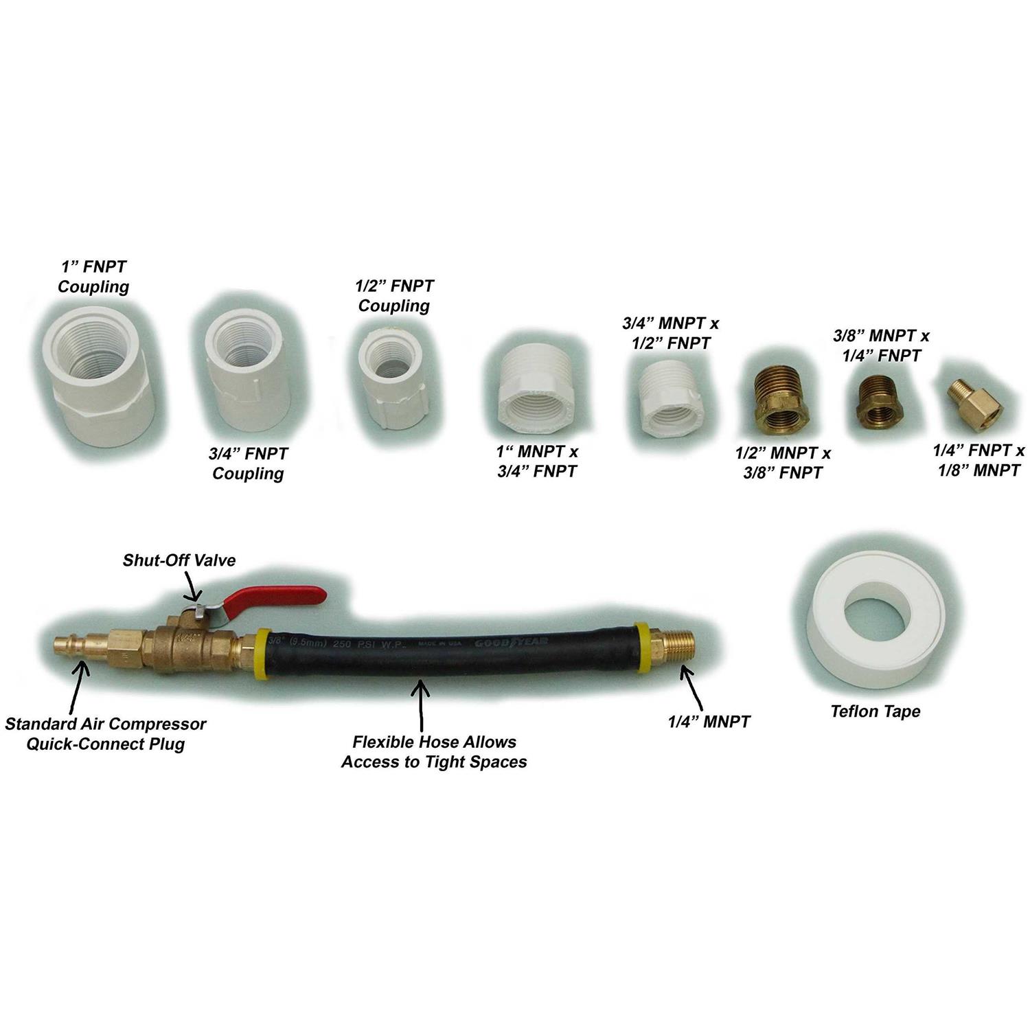 Adaptor to winterize underground irrigation sprinkler systems. Includes printed instructions. Includes most common pipe thread combinations! Avoid multiple trips to the hardware stores. Pressure rating: 250 psi with 4:1 safety factor. All metal parts are brass. Flexible hose is 3/8″ Goodyear Insta-Grip. 100% outdoor rated. Impervious to water and oil.