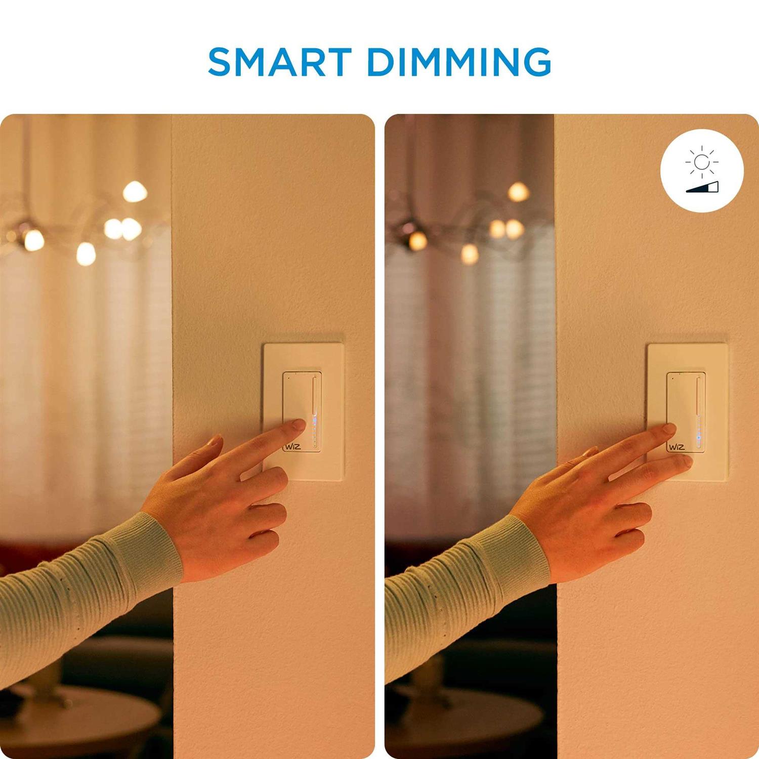 The WiZ smart dimmer makes ordinary lights smart. It works with incandescent, halogen and dimmable LED lamps. Youll be able to control them with your smartphone or your voice. With schedules, you can turn devices on and off to fit your daily routine and save energy. Youll never need to worry about whether youve left your lights or appliances on at home anymore, because you can check on them with your smartphone. If you want, you can group dimmers to control multiple lights together. The smart dimmer replaces regular single pole switches or 3-way switches. Requires neutral wire.
