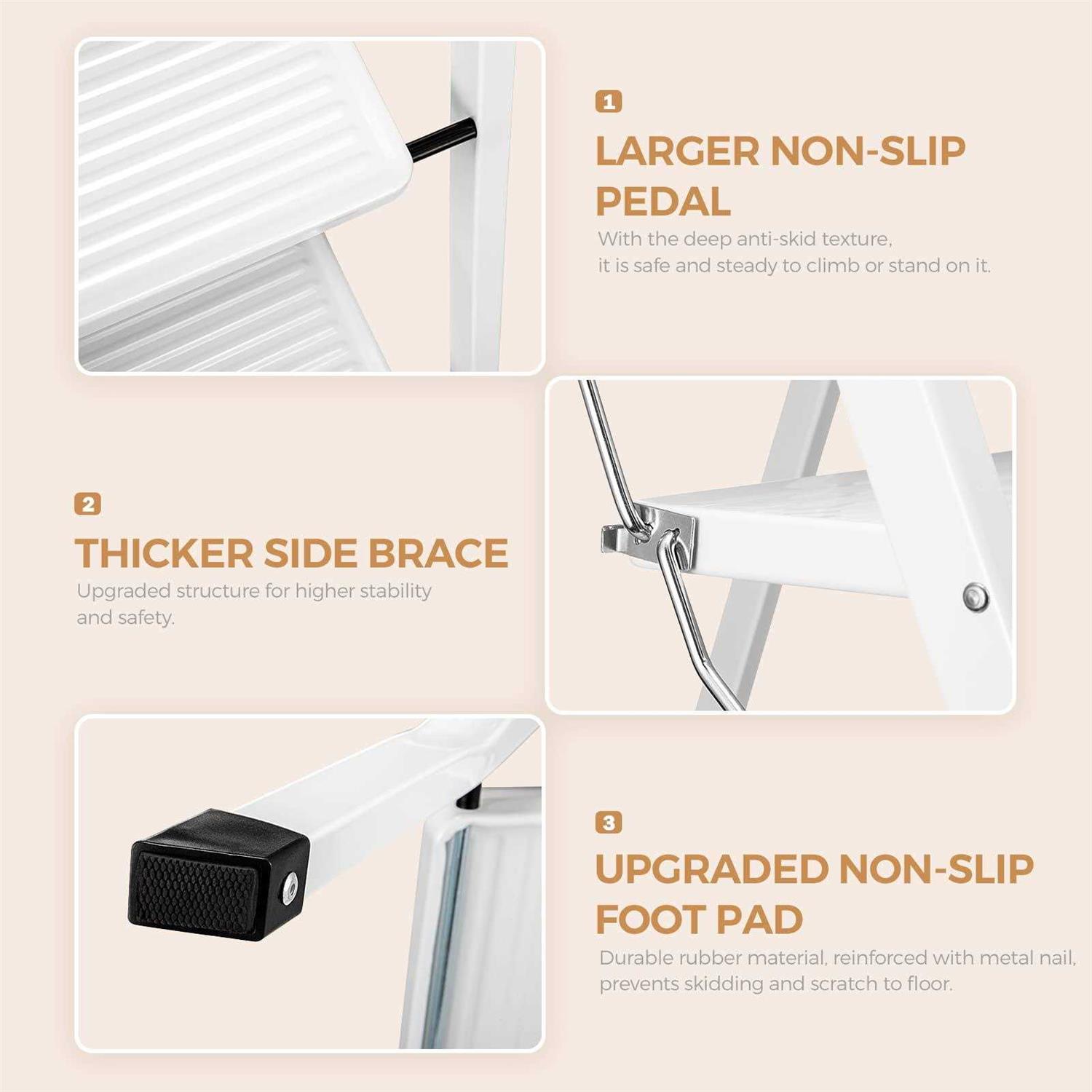 Wohous 3 Step Stool Folding Step Ladder for Adult White Anti-Slip Sturdy and Wide Pedal