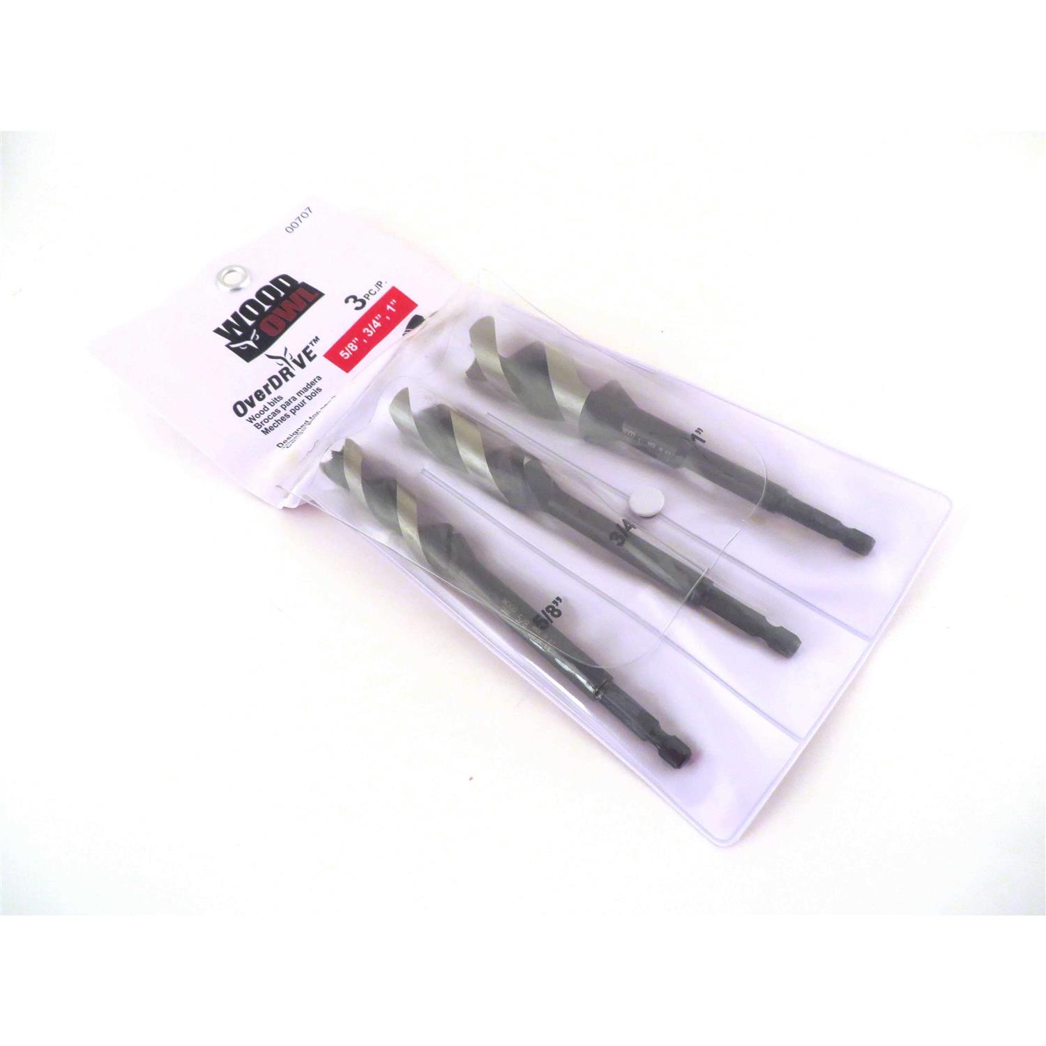 Designed for cordless drills and extending battery life up to 50. Brad point tip and unique chamfered lead-in edge ensure fast on-target starts and smooth cuts. Perfectly concentric design for even and easy cutting of accurately sized holes. Quick-change shank for fast and secure change-out. Performance superior to spade and other utility type twist bits. Induction-hardened carbon steel construction and precision machining make overdrive bits extremely durable and accurate. Packed in a vinyl roll-up storage pouch. Includes 0. 625-in 16mm 0. 75-in 19mm and 1-in 25mm sized drill bits bits are 6. 5-in long. Made in Japan.