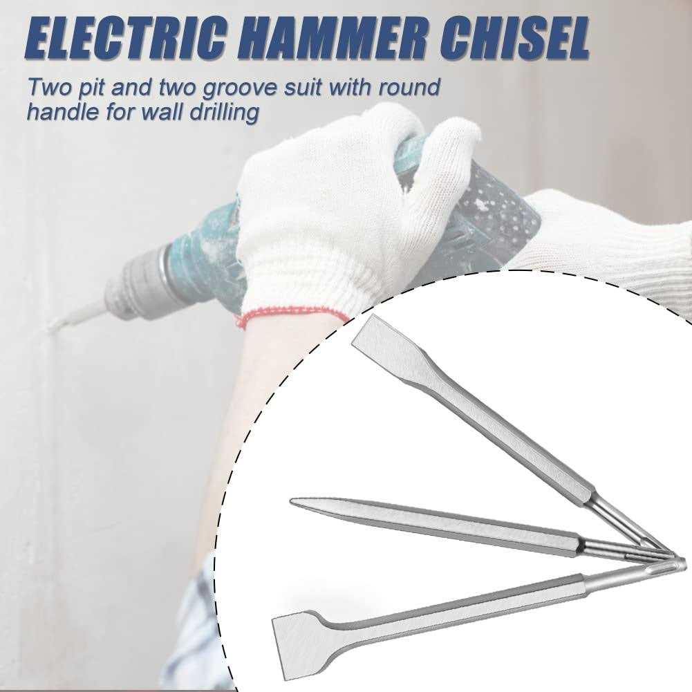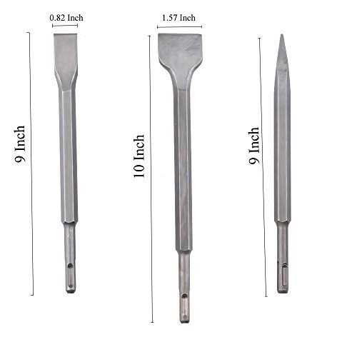 Point Chisel Size: 9 Inch (230mm); Flat Chisel: 0.82 X 9 Inch (20.8 X 230mm); Cranked Chisel: 1.58x 9.84 Inch (40 X 250mm)made Of Premium 40rc Steel, Very Sturdy For Long Using Lifepackage Include: Point Chisel *1, Flat Chisel *1, Cranked Chisel *1; Each Tool Come With An Individual Casefor Concrete Removal, Hard Surface Break Up And Chiselingquick Change And Easy To Use.high Occlusion, Matched Perfectly, Greatly Decrease Harm To Screw Suitable For Sds-plus Electric Or Cordless Hammer For Masonry And Concrete Demolition Manufactured With Heat-treat Process For Necessary Hardness And Durability Specification: Material: Ultrahigh-strength 40rc Steel Point Chisels Size: 9” (230mm) Flat Chisel Size: 0.82 X 9” (20.8 X 230mm) Adapted Machines: Rotary Hammer Cranked Chisels Size: 1.58x 10” (40 X 254mm) Package Content: 1* Hammer Point Chisels 1* Hammer Flat Chisel 1* Hammer Cranked Chisels 3* Carrying Case (each Tool Come With An Individual Case)