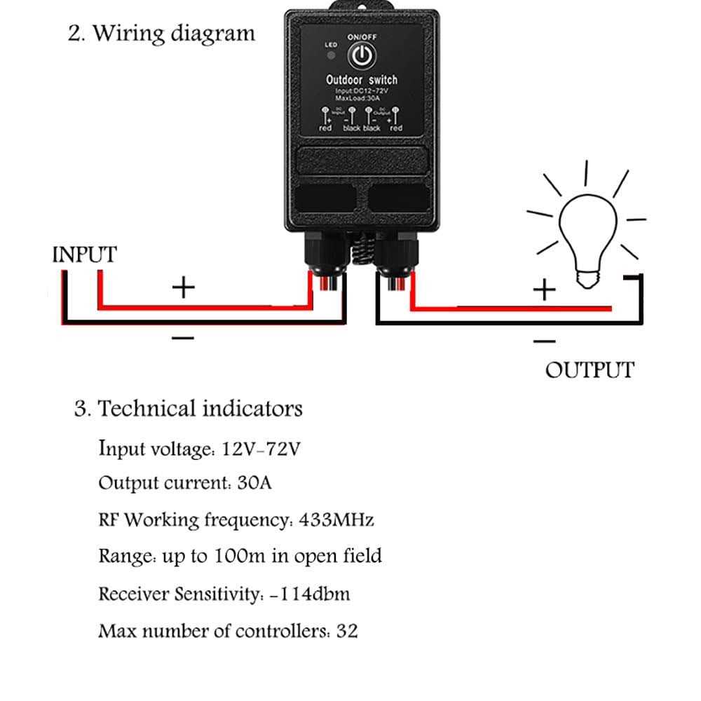 High Power Load:The receiver adopts 40A relay, which can load high-power electrical appliances to ensure long-term stability control.( Note:max load:30A) Strong Singal-Strong RF signal works through walls and doors without any interference; Max range is up to 324ft with no obstacle. IP65 Watertight construction-Waterproof wireless remote control switch is suitable for indoor and outdoor use .use safely even in damp places.Please don’t soak it in water. Easy to Install- Simply install the receiver between the devices to be controlled and the power supply. You can switch your device on and off from anywhere via the remote control switch panel. Wide Application:This long distance remote control switch is used in mud pumps, motors, lamps,fans,dust collect, insecticide machines, sprayers, car washers, bells, etc. various types of electrical equipment.